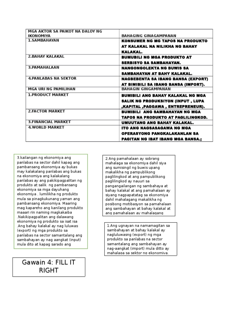 FILL IT RIGHT Ibigay ang bahaging ginagampanan ng mga aktor at pamilihan sa naikot na daloy ng ekonomiya. 1 on a question. Araling Panlipunan 28102019 1529.